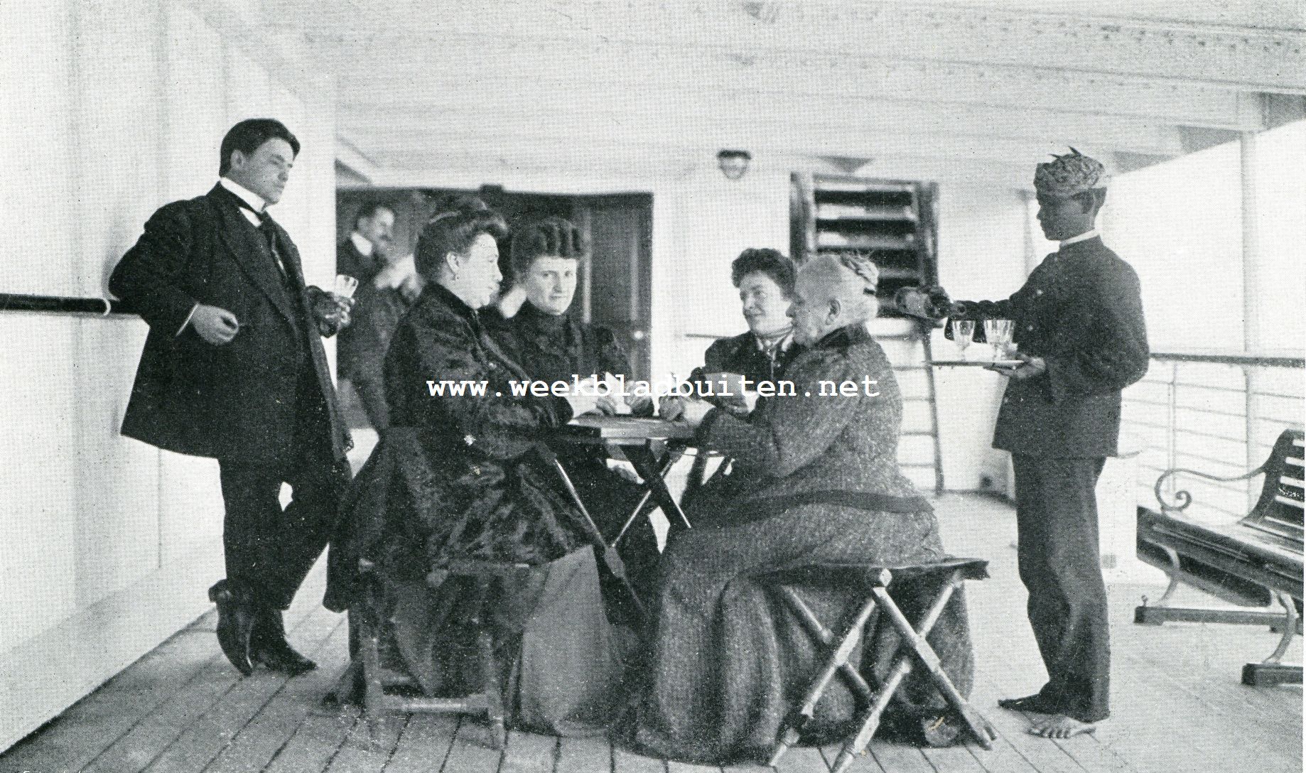 Bijschrift foto:  Met de "Grotius" naar Genua. Het leven aan boord. - Kaartspelende Italiaanschen