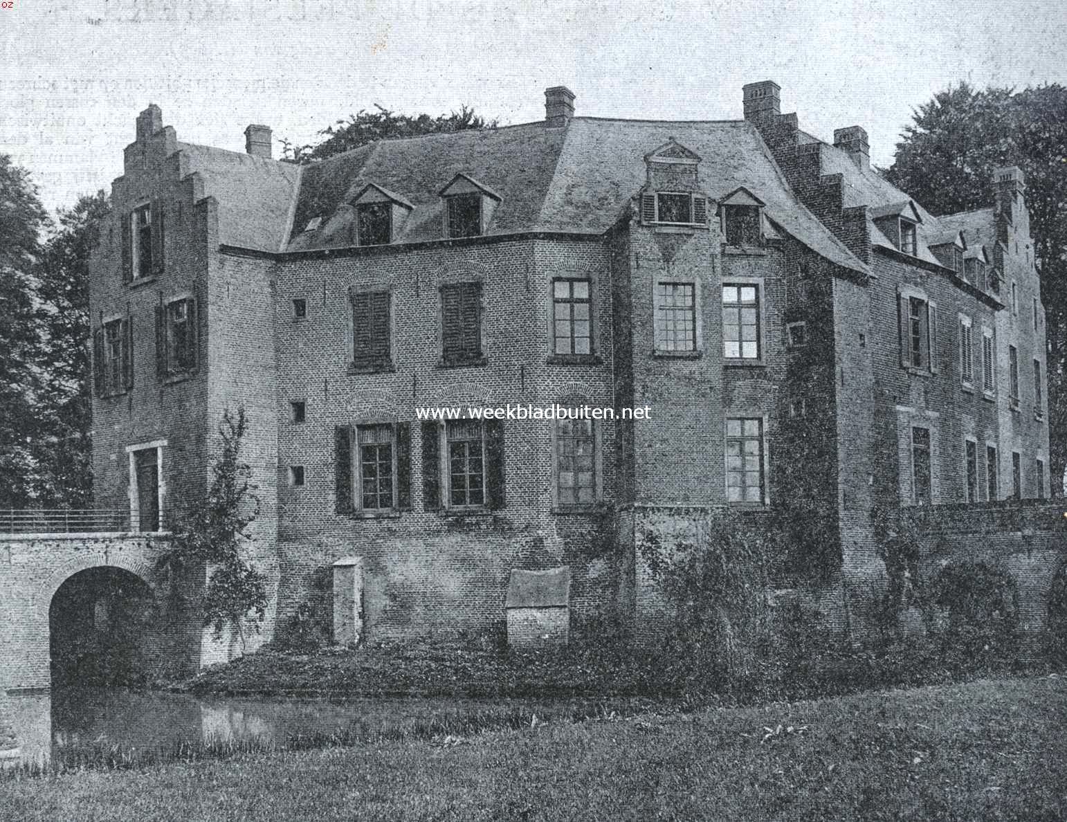 Het kasteel Geysteren bij Venray, in 't begin dezer maand afgebrand. De bosschen, temidden waarvan het oude gebouw eertjds zoo schilderachtig lag, waren reeds in dezen oorlogstijd door den eigenaar gesloopt