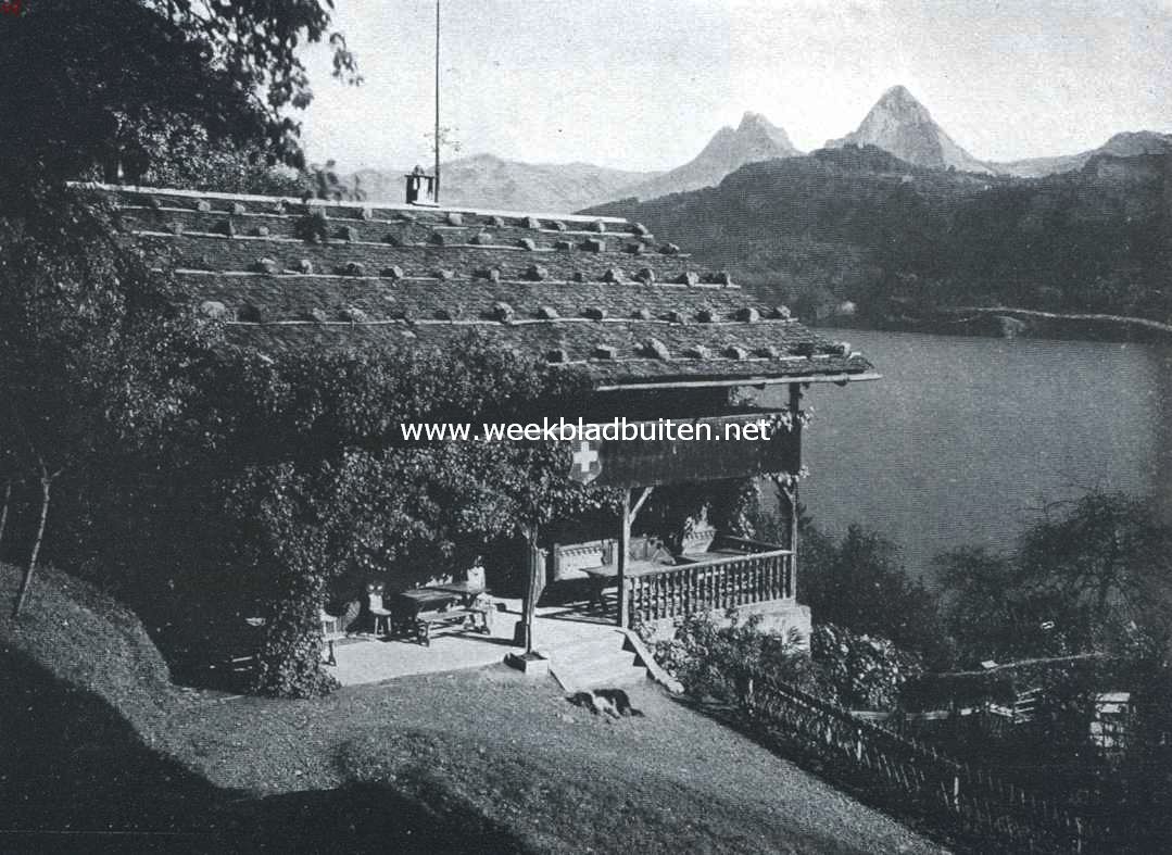 Bijschrift foto:  Het Vierwaldstätter-meer. De oude herberg op den Rütli. Op den achtergrond de toppen der beide Mythen