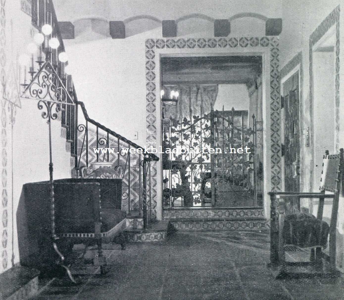 Bijschrift foto:  "Outpost Estates". De "hal" in de woning van Dolores del Rio genomen in de richting van de eetkamer