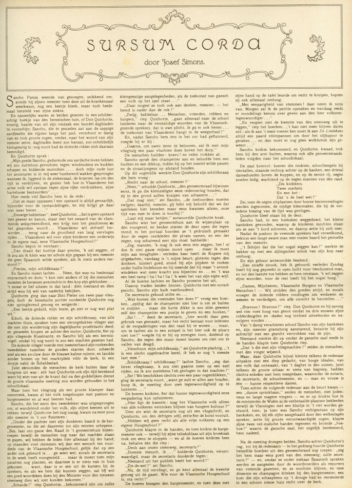 „Hier ligt de kwestie : mag het Vlaamsche volk alleen van alle volkeren verstoken blijven van hoogere kuituur?” Dien zin wist de secretaris nog uit een vlugschrift, en Quichotte, om den deftigen stijl, zette fier de borst vooruit.