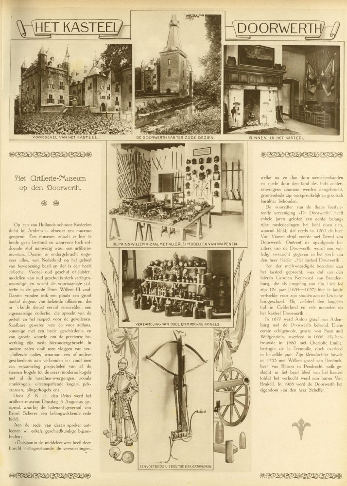 Op een van Hollands schoone Kasteelen dicht bij Arnhem is alweder een museum geopend. Een museum, zooals er hier te lande geen bestond en waarvoor toch voldoende stof aanwezig was: een artillerie-museum. Daarin is ondergebracht ongeveer alles, wat Nederland op het gebied van bewapening bezit en dat is een heele collectie. Vooral oud geschut of juister: modellen van oud geschut is sterk vertegenwoordigd en vormt de voornaamste collectie in de groote Prins Willem III zaal. Daarin vonden ook een plaats een groot aantal degens van bekende officieren, die in 's lands dienst eervol sneuvelden, een eigenaardige collectie, die spreekt van de piëteit en het respect voor de gevallenen. Kostbare geweren van en voor sultans, sommige met een heele geschiedenis en van groote waarde om de precieuse bewerking, zijn mede hierondergebracht. In andere zalen vindt men vlaggen van verschillende naties waaraan een of andere geschiedenis aan verbonden is; vindt men een verzameling projectielen van af de steenen kogels tot de meest moderne kogels met al de tusschen-overgangen, zooals stankkogels, uiteenspattende kogels, pekkransen, slingerkogels enz.