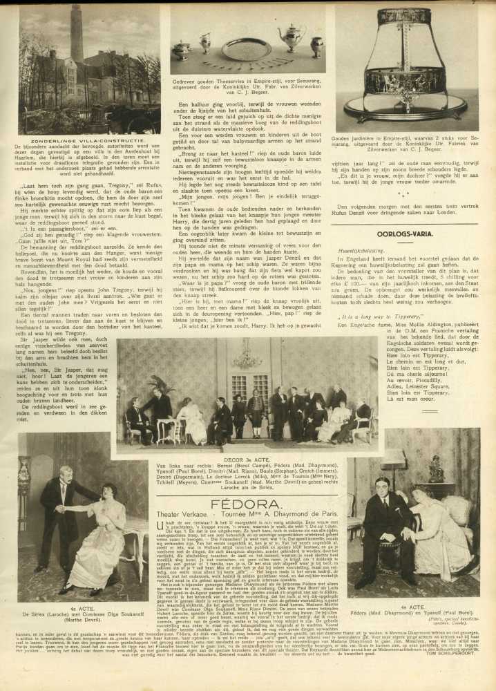 kunnen, en in ieder geval is dit gezelschap ’n aanwinst voor dit tooneelseizoen. Fédora, als stuk van Sardou, mag bekend genoeg worden geacht, om niet daarover thans uit te weiden. In Mevrouw Dhayrmond hebben we met genoegen,