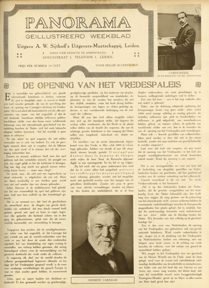 Er is nauwelijks een gebeurlijkheid van groote internationale beteekenis te denken, waarvan de1 spot in dergelijke mate, in woord en beeld, zich heeft meester gemaakt, als van de oprichting, den bouw, de opening van Carnegie' s stichting, het Vredespaleis. Het is wel alsof alle humoristen ter wereld, allecari-caturisten van naam, van het oogenblik af dat de edel denkende Amerikaan ettelijke millioenen guldens beschikbaar stelde voor den bouw eener schitterende behuizinge voor het internationale gerechtshof van bemiddeling tusschen de Staten, zich het oude latijnsche adagium hebben herinnerd, »dat het moeilijk is geen satyre te schrijven,