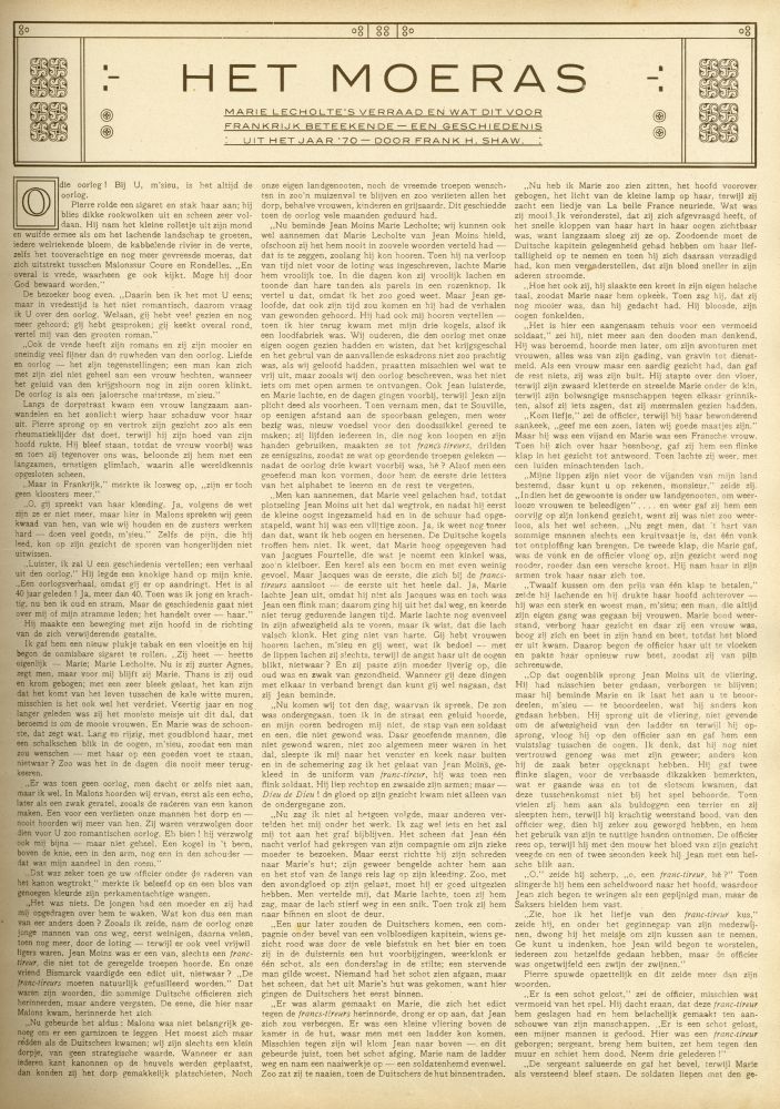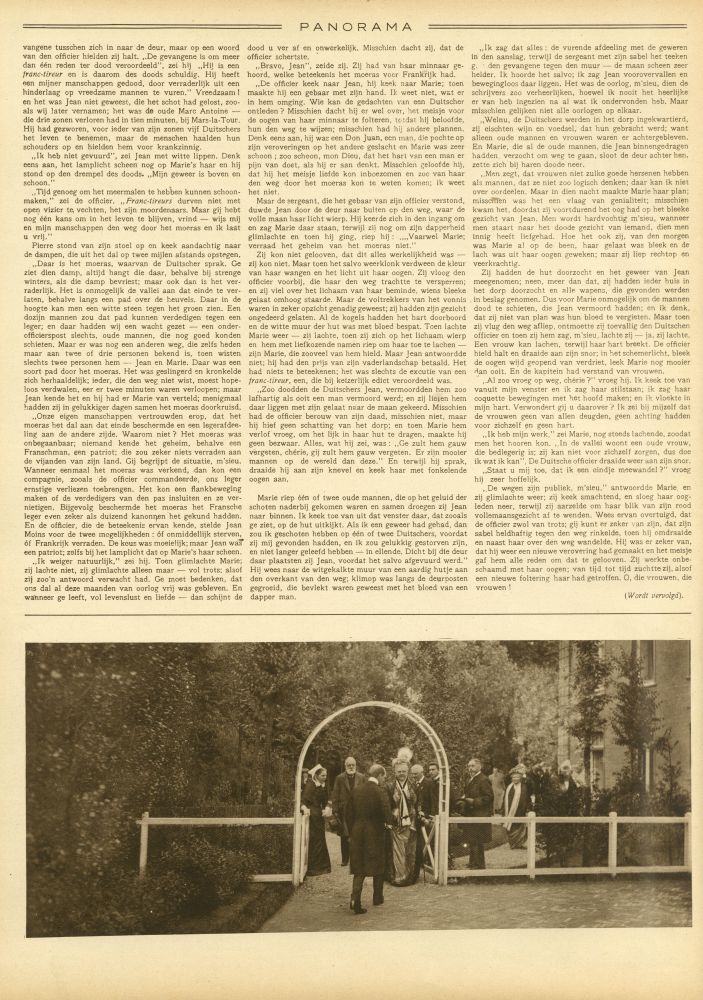 „Een uur later zouden de Duitschers komen, een compagnie onder bevel van een volbloedigen kapitein, wiens gezicht rood was door de vele biefstuk en het bier en toen