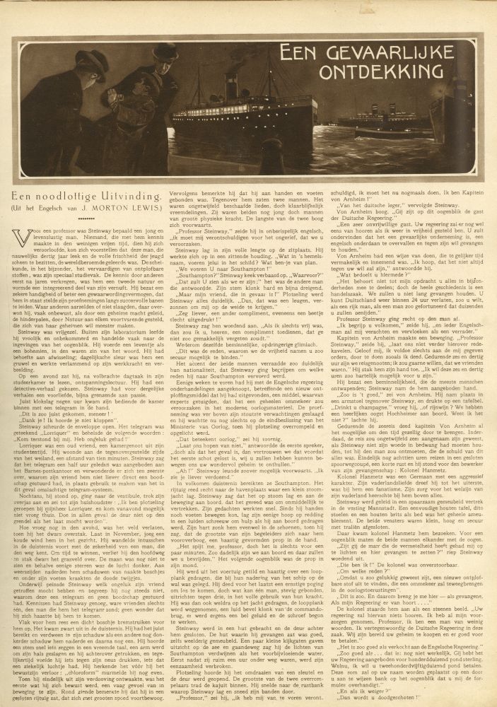 Eenige weken te voren had hij met de Engelsche regeering onderhandel ingen aangeknoopt, betreffende een nieuw ont-ploffingsmiddel dat hij had uitgevonden, een middel, waarvan experts getuigden, dat het een geheelen ommekeer zou veroorzaken in het moderne oorlogsmaterieel. De proefneming was ver boven zijn stoutste verwachtingen geslaagd en hij wachtte nu nog slechts op de eindbeslissing van het Ministerie van Oorlog, toen hij plotseling overrompeld en opgelicht werd.