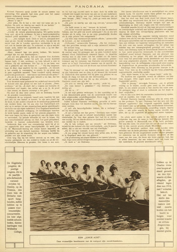 Vooi een professor was Steinway bepaald een jong en levenslustig man. Niemand, die met hem kennis maakte in den weinigen vrijen tijd, dien hij zich veroorloofde, kon zich voorstellen dat deze man, die nauwelijks dertig jaar leek en de volle frischheid der jeugd scheen te bezitten, de wereldberoemde geleerde was. De scheikunde, in het bijzonder, het vervaardigen van ontplofbare stoffen , was zijn speciaal studievak. De kennis door anderen eerst na jaren verkregen, was hem een tweede natuur en vormde een integreerend deel van zijn vernuft. Hij bezat een zekere handigheid of beter een gewaarwordingsvermogen, dat hem in staat stelde zijn proefnemingen langs succesvolle banen te leiden. Waar anderen aarzelden of niet slaagden, daar over-woft hij, vaak onbewust, als door een geheime macht geleid, de hinderpalen, door Natuur aan eiken voortvarende gesteld, die zich van haar geheimen wil meester maken.