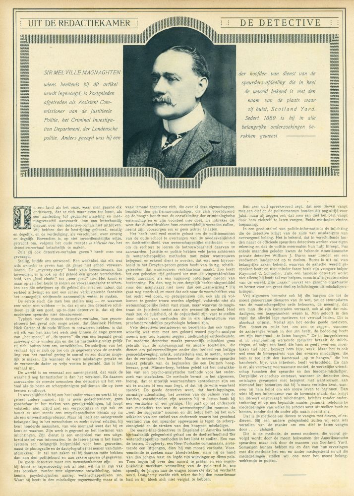 Dit is de methode, de meest moderne, die vooral gevolgd wordt door de meest bekwamen der Amerikaansche speurders maar ook door de mannen van Scotland Yard. Sommigen hunner hebben nu en dan van hun ervaringen met die methode het een en ander medegedeeld en uit die mededeelingen stellen wij ons voor het meest belangwekkende te putten.