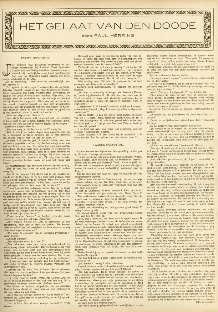 „Dat spreek ik niet tegen,” antwoordde de sergeant-detective Kestrel, „maar ze zal haar broeders correspondentie opzenden. Hij heeft, volgens mijn overtuiging de hand in een groot internationaal misdrijf. Kijk eens, Jim Brankin kent het bankwezen op zijn duimpje en iemand van zijn kennis is zeer gezocht. Hij is een heer in zijn uiterlijk, spreekt vloeiend fransch en kan zich gemakkelijk aanpassen aan het gemengde publiek van Casino of Kuur-zaal. Mogelijk speelt hij zijn rolletje onder de oplichters op het vasteland, maar ik denk toch eerder