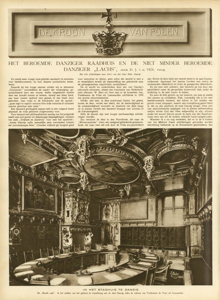 De rij wordt nu onderbroken door een van Danzig's schoonste schouwen, alweer een kunststuk van Nederland-sche afkomst. W. Bart uit Gent was er de bouwheer van, Vredemann de Vries uit Leeuwarden schilderde in 1593 het groote schoorsteenstuk.