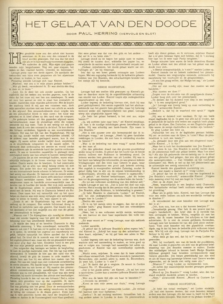 „Hij was er duizend voet vandaan. Er ligt een heele stapel dagbladen bij je. In geen van alle zul-je vinden, dat er gedurende de laatste drie weken een ongeluk heeft plaats gehad in de Alpen. Een Duitscher, en een Engelsche geestelijke waren de eenige slachtoffers en beiden zijn herkend.”
