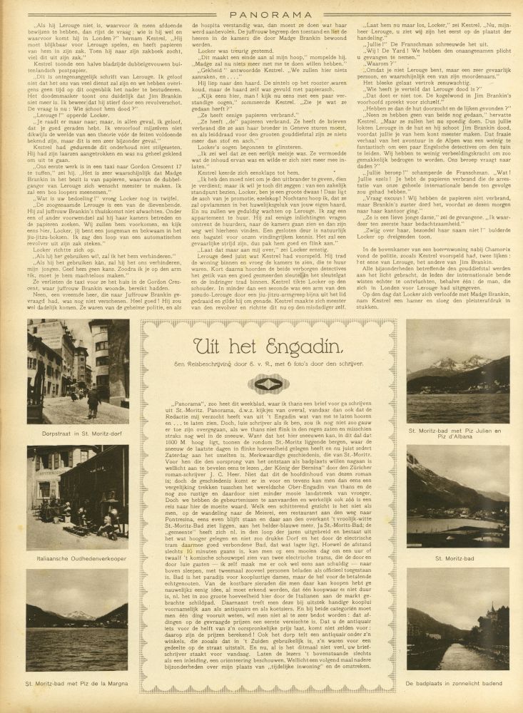 „Om den gebroken draad van den grooten gouddiefstal weder terug te vinden. Ik geloof dat het hoofd van de bende slechts indirect met Robinson in betrekking stond. De brieven werden hem gezonden van uit Londen. Hij was in het bezit van belangrijke informatiën, en was gewoon iederen Vrijdagmorgen met den trein naar Geneve te gaan, waar hij aan het postkantoor een groot pak brieven ontving. Het ongeluk is voorgevallen verleden Zaterdag, zoodat ik geloof tijdig hier te zijn om de nieuwe brievenzending te onderscheppen, alvorens zij naar Geneve is opgezonden.”